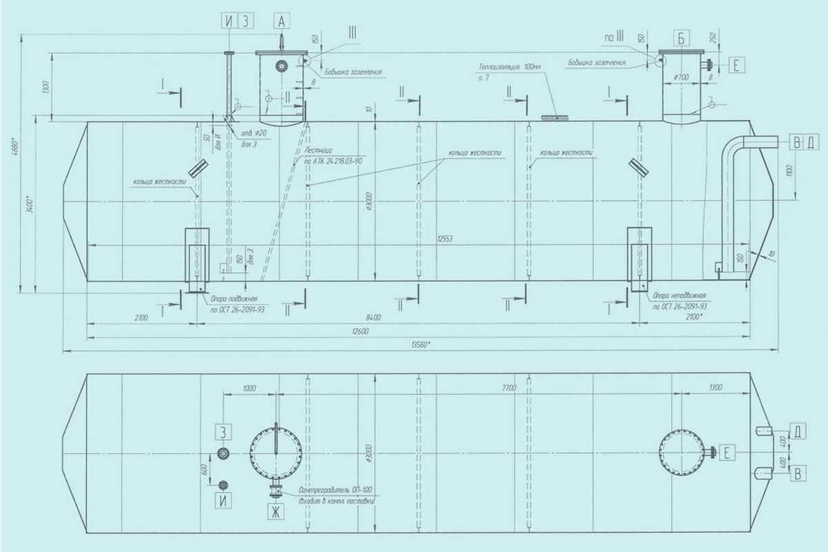 Емкость для дренажа вид цельнометаллического сварного сосуда с круглым сечением, который располагается горизонтально. EП и EПП проектируются с торцами конической или эллиптической формы. За сохранение формы и целостности конструкции отвечают кольца жесткости, расположенные внутри сосуда на равном расстоянии друг от друга.